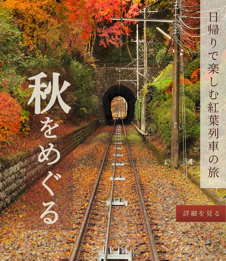 紅葉の旅をテーマに、線路とトンネルが奥へ続く風景を活かしたWebバナーを制作しました。